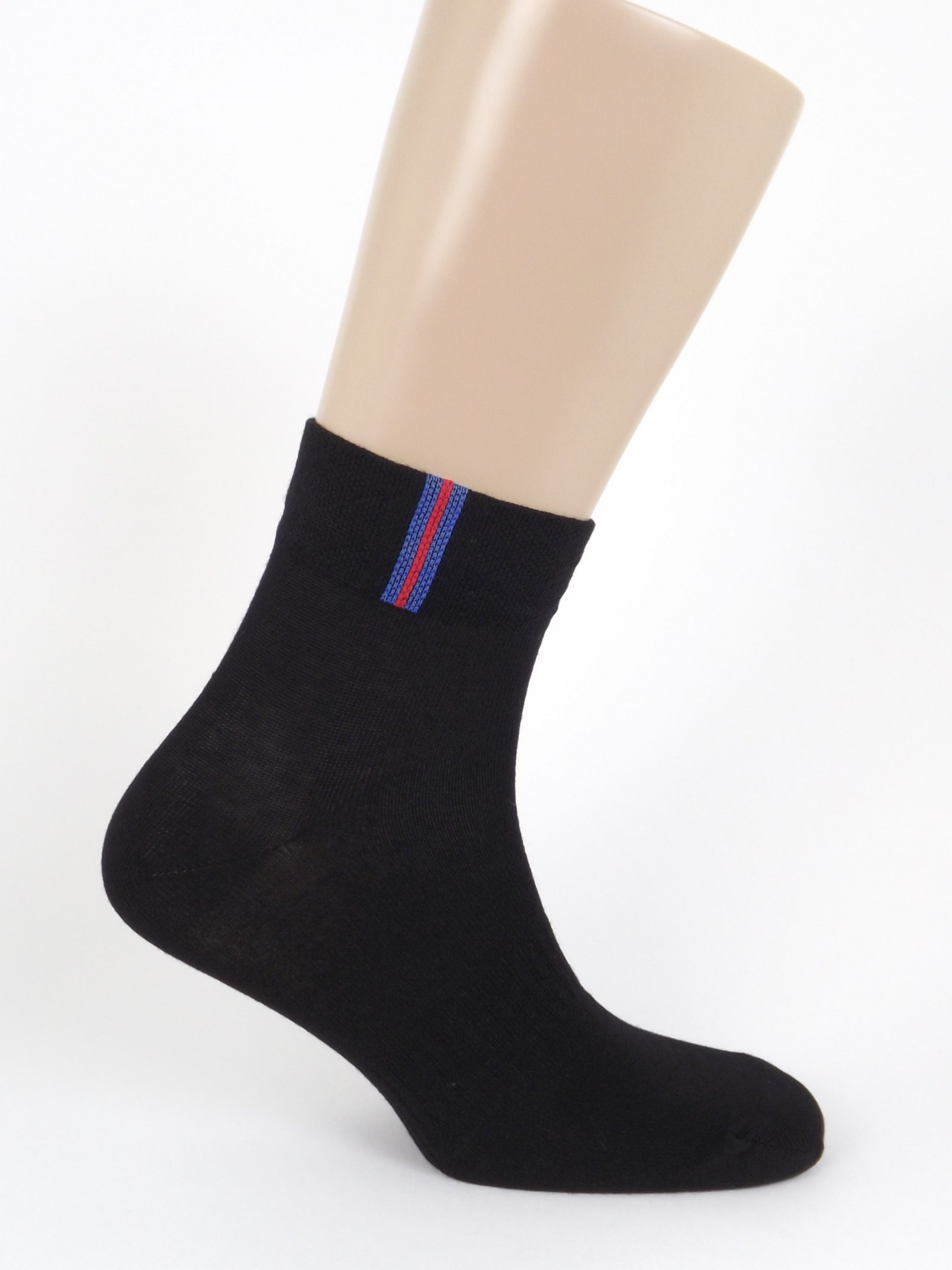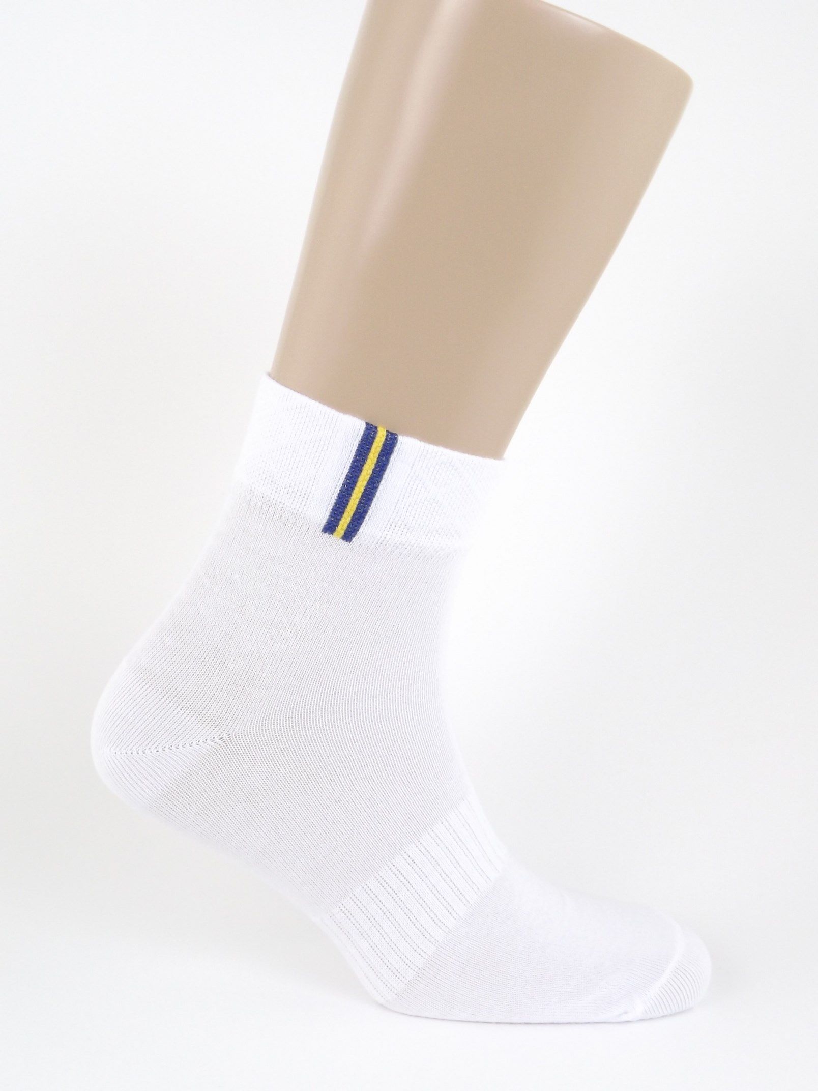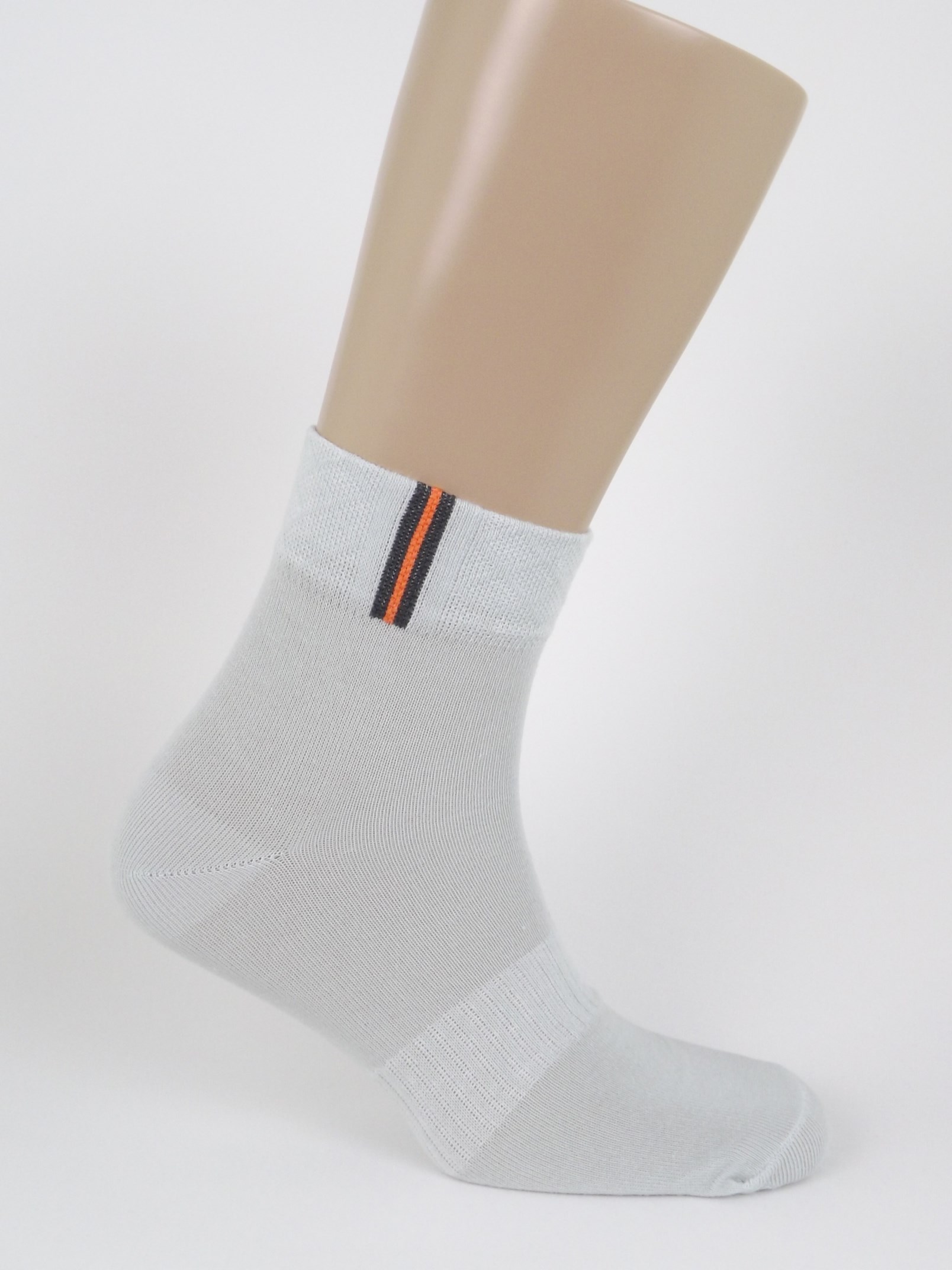 Однотонный спортивный носок с цветными вертикальными полосами на резинке. Средний паголенок и анатомическая резинка на середине ступни.
