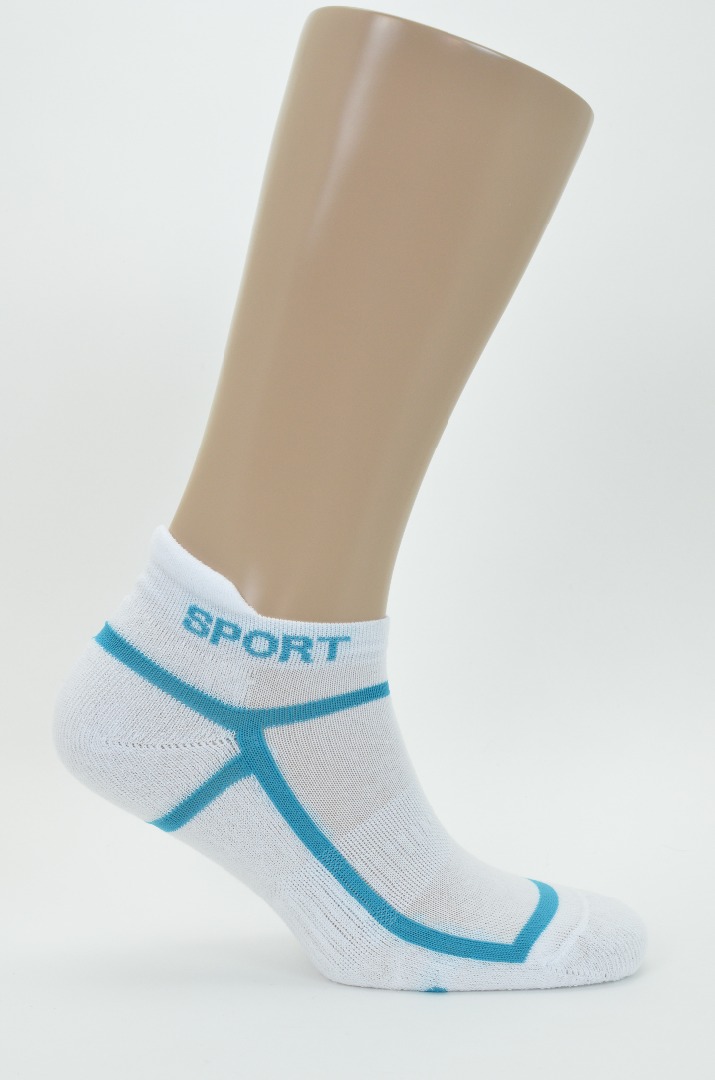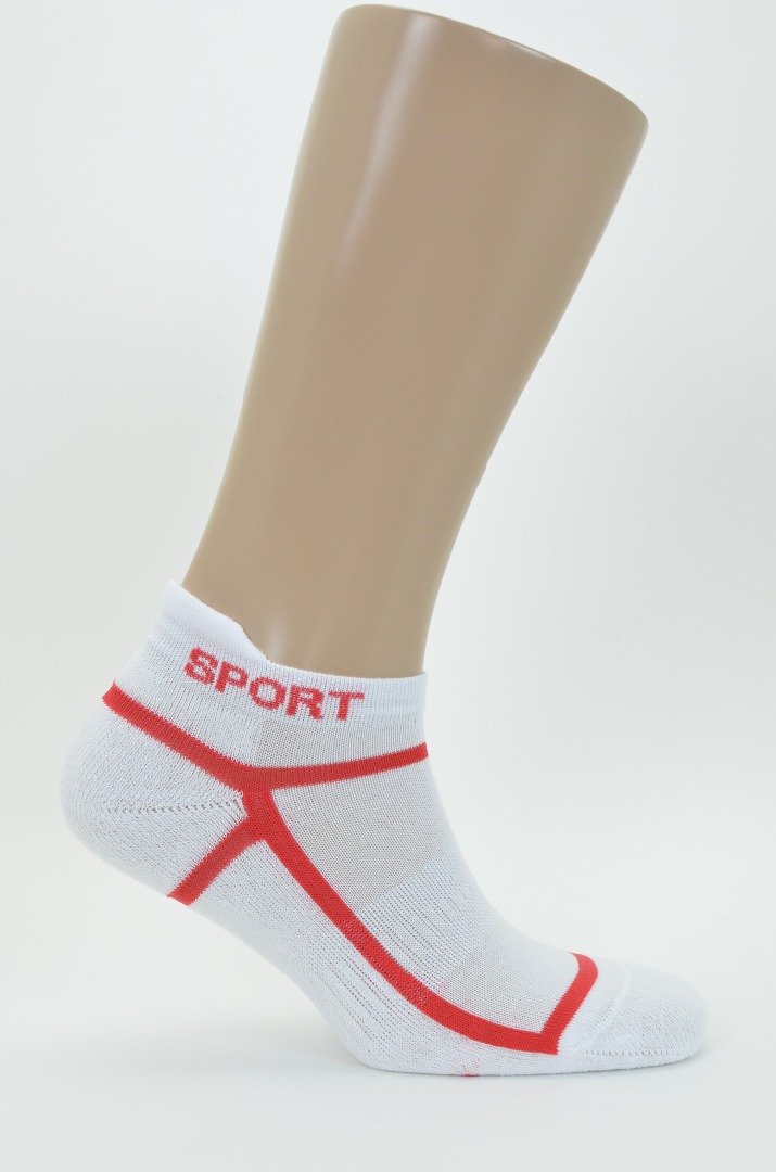 Спортивный носок с анатомической резинкой на середине ступни, плюшевым следом, низким паголенком и "язычком" на борте. Контрастные линии по всему носку и надпись "SPORT".